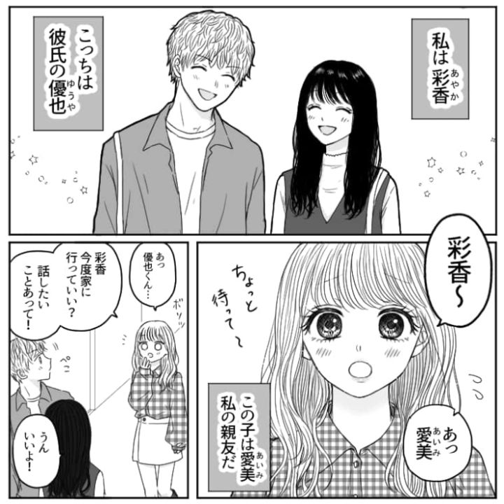 彼氏と歩いているときに親友から話しかけられた様子の主人公。このあとまさかあんなことになるとは、このとき想像もしていませんでした。