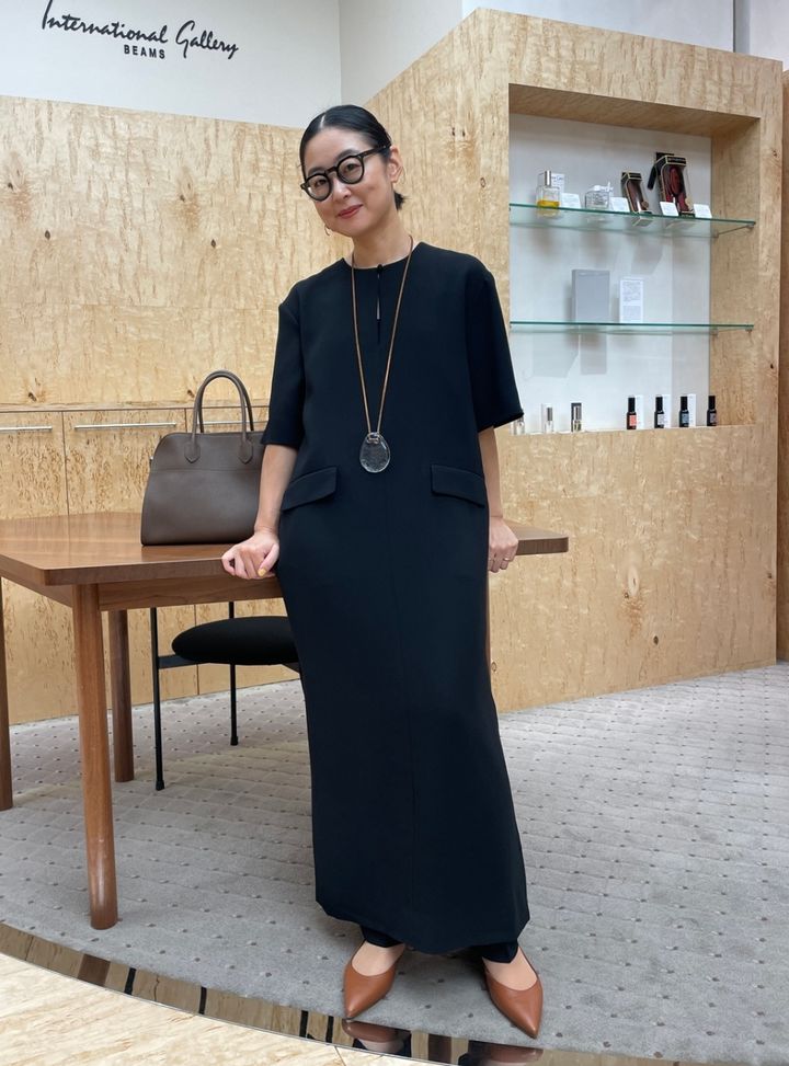 「ブラックのミニマルなコーディネートに、カラートーンを揃えた小物で個性と軽さをアクセントにしました。深めに入ったサイドスリットを生かし、ドレスの下にはパンツをレイヤード。ブラックカラーながらサラリとしたクレープ素材なので重くならずに着られます」