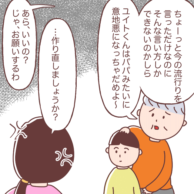 「ちょーっと居間の流行りを言っただけなのに、そんな言い方しかできないのかしら?ユイトくんはパパみたいに意地悪になっちゃだめよ~」