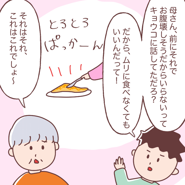 「母さん、前にそれで『お腹壊しそうだからいらない』ってキョウコに話してただろ?だから、無理に食べなくてもいいんだって!」