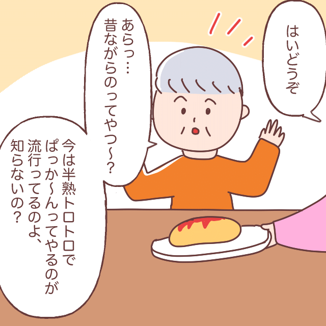 夫が、以前義母が「とろとろぱっかーんのオムライス」にケチをつけたことを持ち出すと、