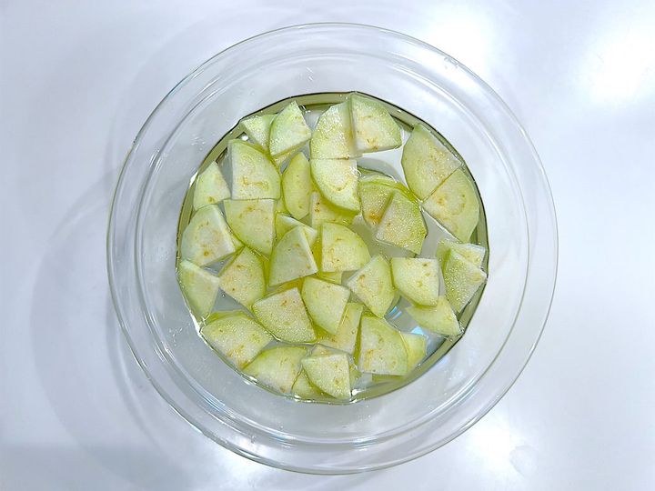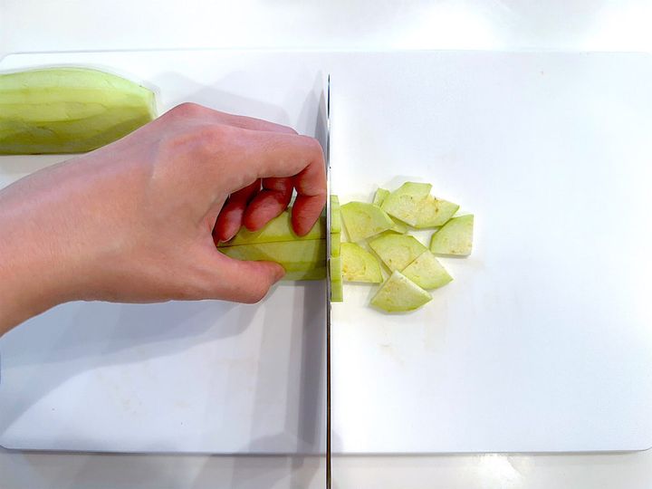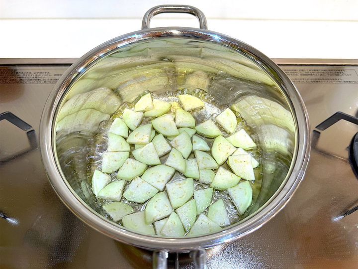 1. なすはピーラーで皮を剥き、いちょう切りにして水(分量外)に浸しアク抜きする。