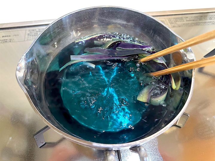 3分くらい煮ると、少しずつ鮮やかな色が出てきますよ〜。