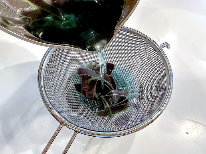 2. 鍋に水(300ml)と1で剥いたなすの皮を入れ、中火で5分ほど煮たらザルで濾す。