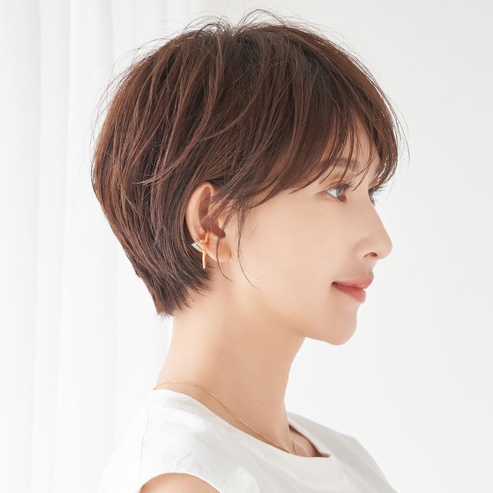 毛量が多くて湿気が多いとボサついてどんどん広がる髪質ならば、膨らみやすい衿足を締めたメリハリのあるシルエットに。梅雨時期も扱いやすいショートを楽しめます。