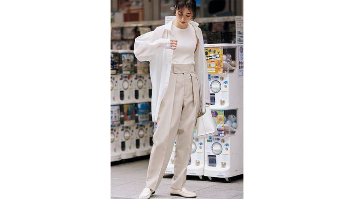 パンツ¥28,600(プルミエ アロンディスモン)タンクトップ¥7,700(ネイブ)シャツ¥25,300(ロエフ/ユナイテッドアローズ 原宿本店)バッグ¥36,300(トーヴ/トゥモローランド)ローファー¥77,000(ヘリュー/ショールーム セッション)ピアス¥14,300(ジュエッテ)