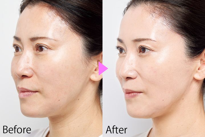 フェイスラインのもたつきがスッキリしてアゴ先がシャープになり、驚くほど小顔に。気になっていた面長感がかなり解消されました。さらに肌のくすみが晴れて、見違えるような明るさと、ハリ感や弾力も格段にアップしました。