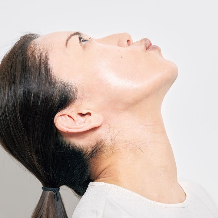 ①パール粒2コ分を手に取りなじませたら肩が上がらないようにアゴを上げ10秒キープ。表情筋を鍛えるメソッドをプラスして効果アップ。