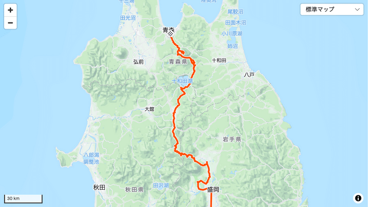 神戸空港→仙台空港→平泉→盛岡→八幡平(はちまんたい)→十和田湖→奥入瀬渓流(おいらせけいりゅう)→八甲田十和田(はっこうだとわだ)ゴールドライン→青森→金木町(約270km / 5日間)
