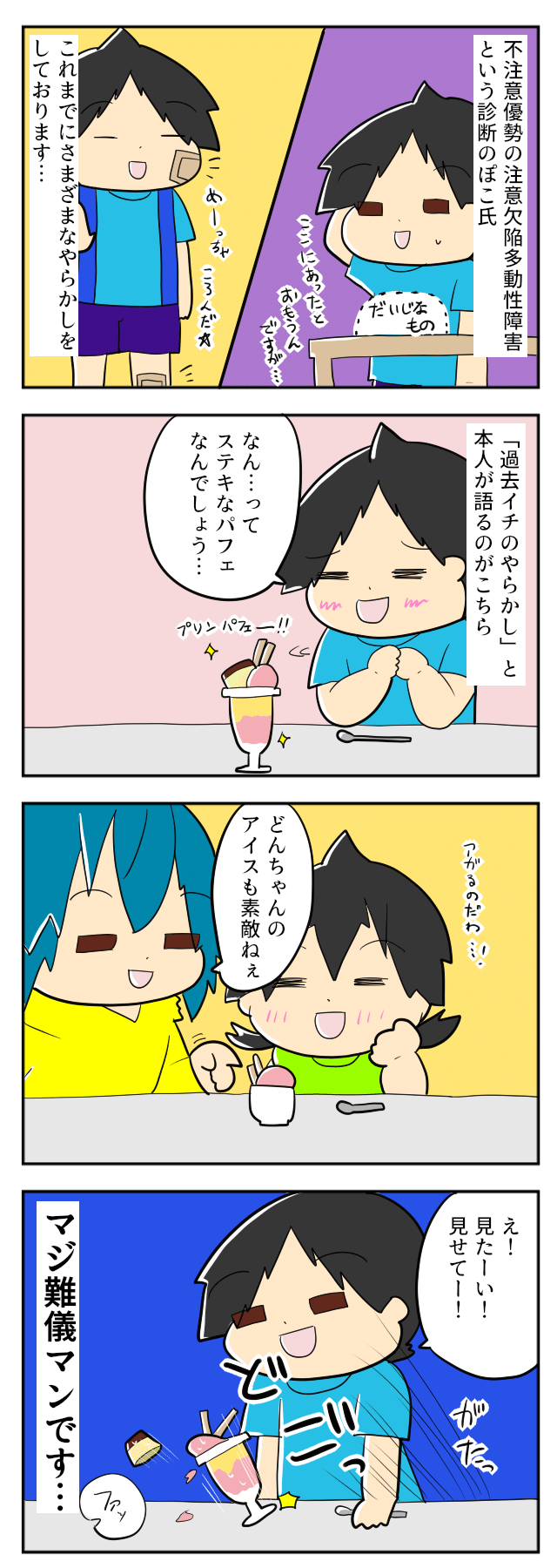 このパフェの話のような感じで、不注意であったが故の失敗(忘れ物・転んだ等)が多いです。