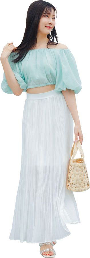露出がやや多めでも、きれい色&バルーンスリーブで、女性らしい柔らかさはしっかりキ ープ。スカートも裾部分にシアー感があるものを選んで、軽やかに。