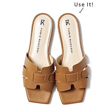 キャメルフラットサンダル/ファビオ ルスコーニ(ファビオ ルスコーニ ルミネ有楽町店) アッパーにデザイン性をもたせることで、シンプルな服の程よいアクセントにも。