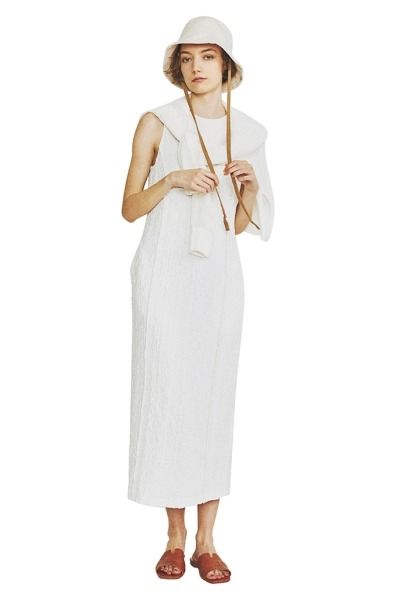 サンダルは履き回し。白と色の強弱をつけすぎず、やさしく引き締めるブラウンは夏に重宝する色。白ワンピースの甘さは保ちつつも、ぺたんこサンダルで品よくドレスダウン。