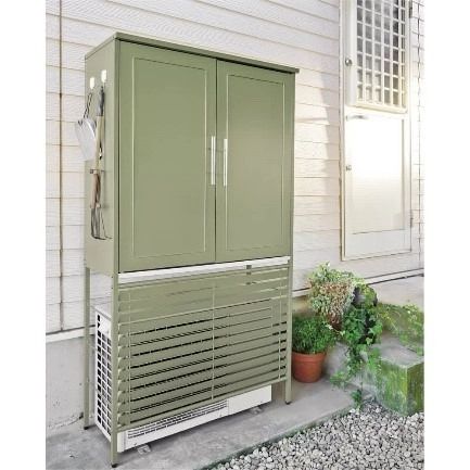 『dinos(ディノス)』の室外機カバーは上部に大きめの収納庫つき!くすみグリーンのカラーが庭の植物ともなじみやすそうです。