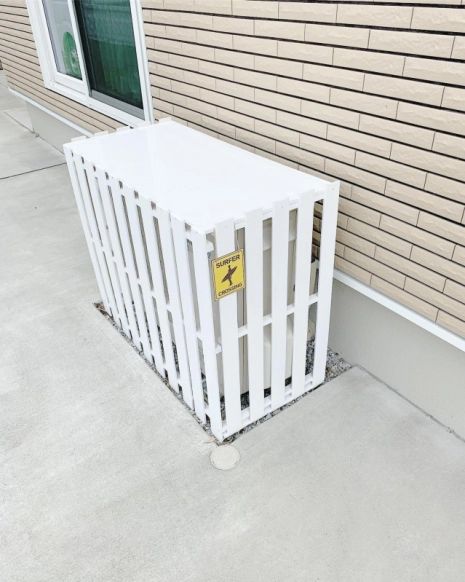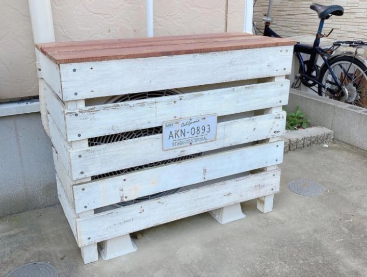 こちらはフェンスに使っていた廃材を再利用して室外機カバーをDIYした例です。全体を白塗りした中にアンティーク調のナンバープレートがポイントになっていて素敵です。