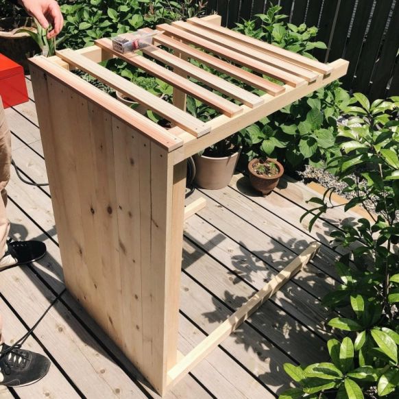カットが終わったすのこを組立てましょう。天板の横にL字金具をつけると強度がアップします。