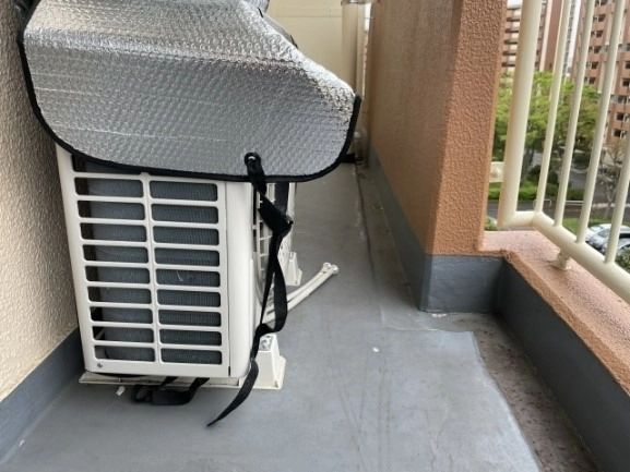 狭いベランダに室外機がある場合、ベランダの壁面を利用すると簡単に日除け対策ができます。