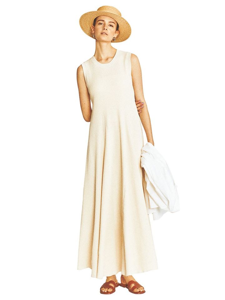 ワンピース/ガリャルダガランテ 真っ白よりも力みがなく、形は甘めでも素材はカジュアル。ワンピは1枚で着ればドレッシーに、さらにトップスを重ねて着るのにも適する、フィット&フレアシルエットのキャミタイプをセレクト。