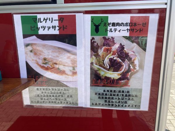 ”マルゲリータピッツァサンド”と”えぞ鹿肉のボロネーゼトルティーヤサンド”の写真が貼ってあり、確かにトルティーヤみたいですね(メニューにもそう書いてあります)。