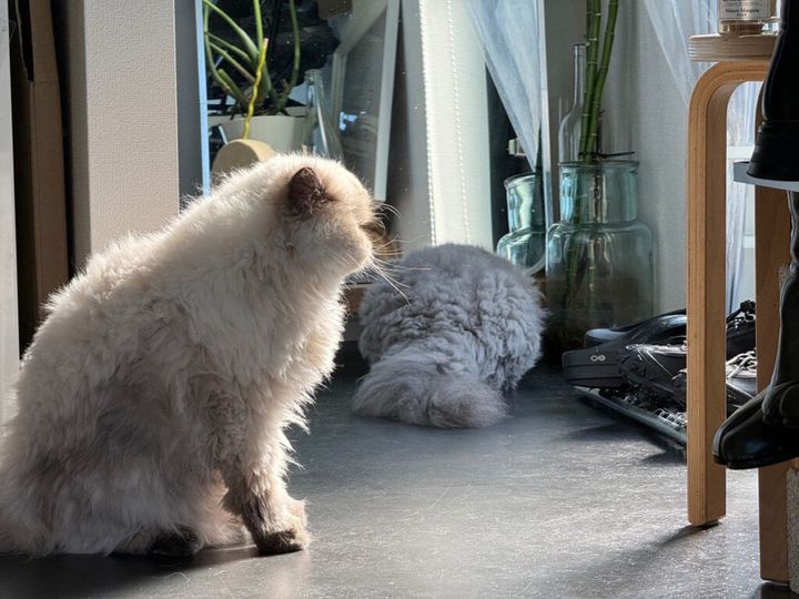 仲良し兄弟の、ねことこねこと申します。名前は必ず聞き返されてしまうけど、飼い主さんはとても気に入ってるみたい。白くてふわふわぼでぃーが、ねこ(兄)。グレーのクルクルな毛並みが、こねこ(弟)。愛称はねこちゃん、こねちゃん。こねちゃんのほうが弟なのに、ねこちゃんより大きくなってしまったのはここだけのハナシだよ。本誌2024年8月号にて、わたなべとしふみさんによるねことこねこの紹介イラストを掲載しています。
