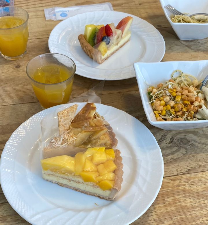 出典:MORE 奥フルーツタルト、手前キャラメルバナナタルト、アップルマンゴータルト。ドリンクマンゴージュース