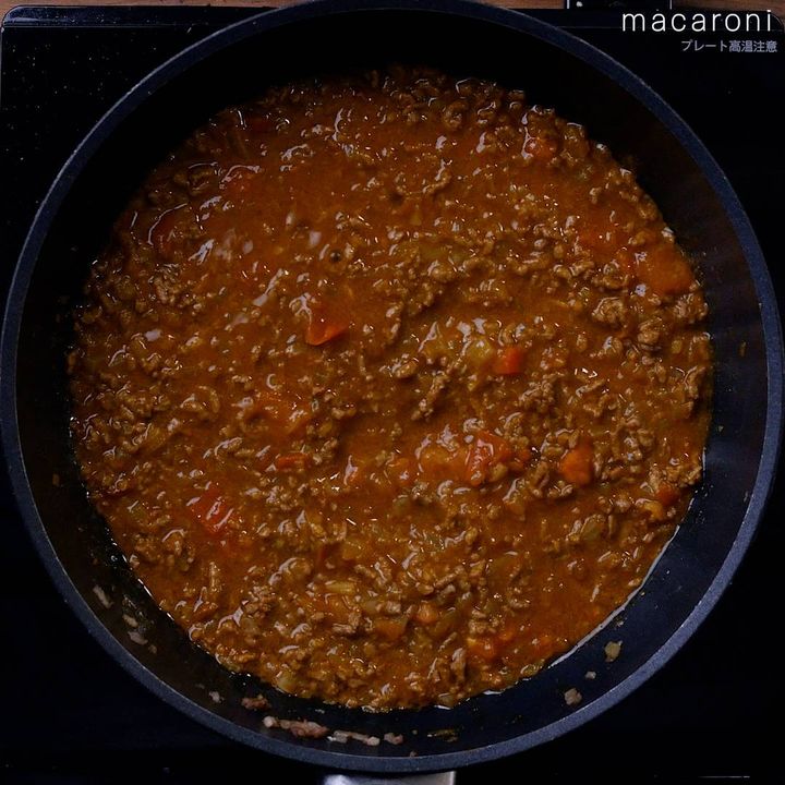5: なすを加えてさらに8〜10分ほど煮込み、塩、こしょうを加えて味を調えます。器にごはん、キーマカレーを盛り付けて完成です。