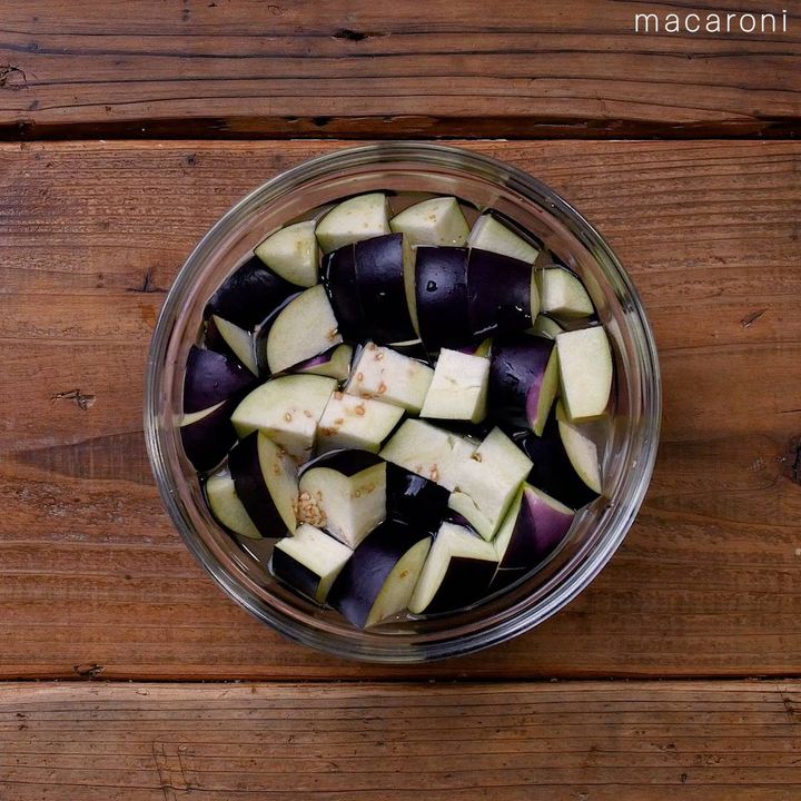 なすは最後に加えるので、変色しないよう水にさらしてアク抜きをしてください。
