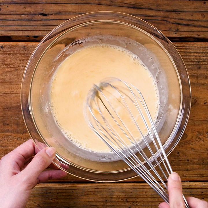 2: ボウルに卵を割り入れて溶きほぐし、グラニュー糖、牛乳、サラダ油を加えて混ぜます。