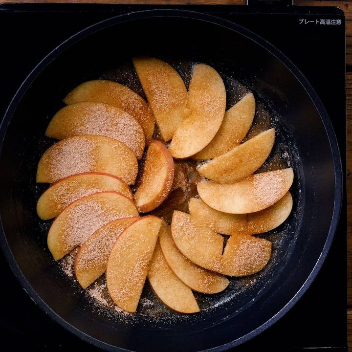 4: フライパンにバターを熱し、スライスしたりんごを並べ、グラニュー糖、シナモンパウダーを振りかけます。