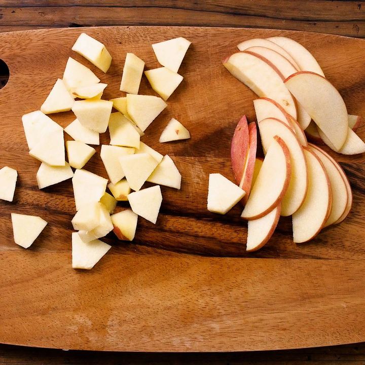 1: りんごは4等分に切って芯を取り除き、半分は厚さ5mmの薄切りにし、残りは皮をむいていちょう切りにします。