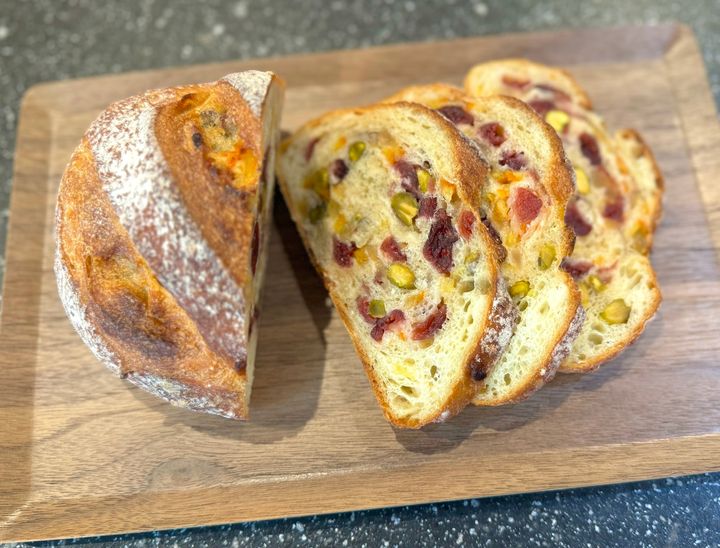 北海道産小麦100%で作られたフランスパンに、柑橘系のドライフルーツとピスタチオが端から端までたっぷり!