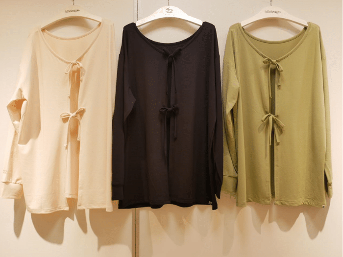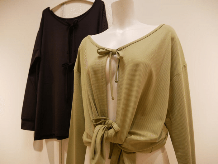 シンプルな無地の長そでカットソーのような見た目ですが、バックスタイルはひもがついていて、こちらを正面にして着たり、すそを結んでショート丈にして着たり、ひもをほどいてカーディガンのように着用できるなど、1枚でさまざまな着方ができるんです。