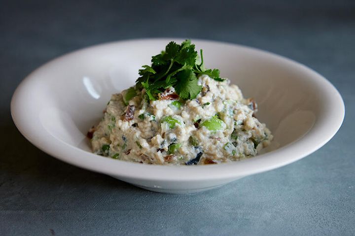 ボウルに豆腐を入れて粗くつぶし、ピータンの黄身、醤油、胡麻油、黒酢、塩を混ぜる。枝豆、みょうが、香菜、生姜、ピータンの白身を加えて和え、香菜の葉を飾る。