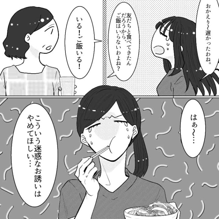 友達から食事に誘われた主人公。一緒にご飯屋さんに行きますが、友達がご飯を注文しないと言い始め・・・。