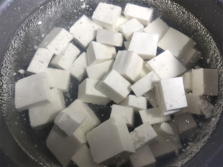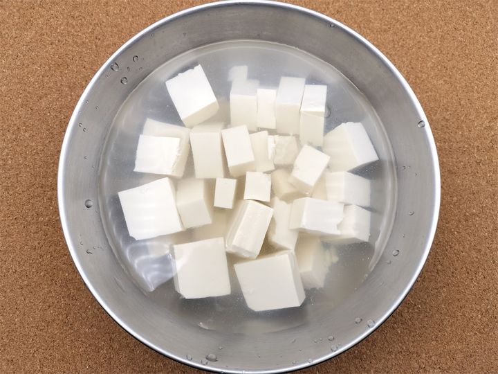 1. 豆腐を1.5~2cm程度の角切りにして、乾かないように水に入れておきます。