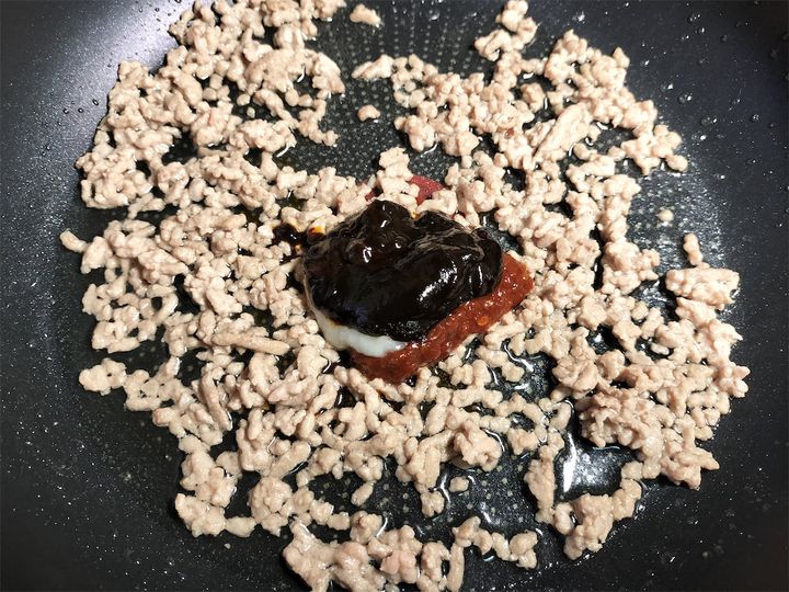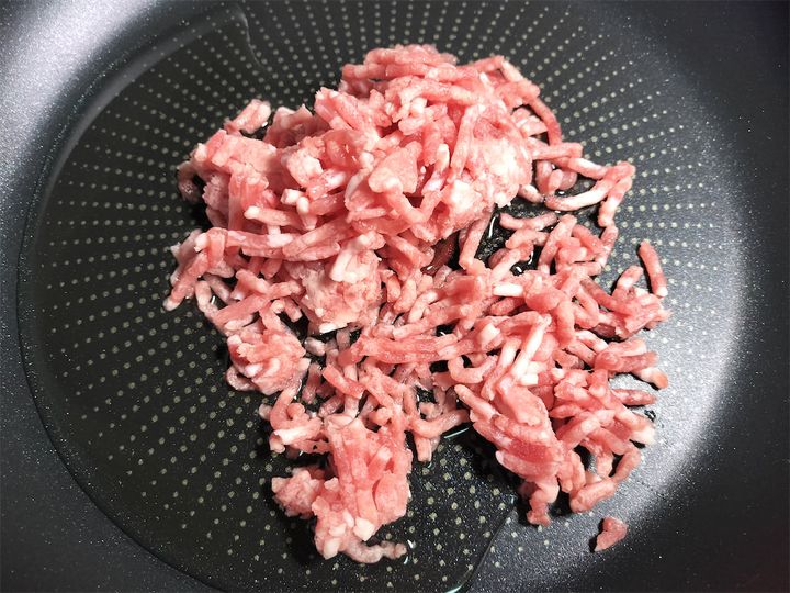 3. フライパンにサラダ油大さじ2をひき、豚ひき肉を入れて中火にかけ、潰しながらよく火が通るまで炒めます。