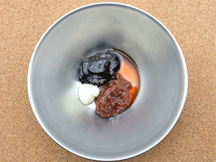 2. ボウルに豆板醤、おろしにんにく、甜麵醬、ラー油を入れておきます。