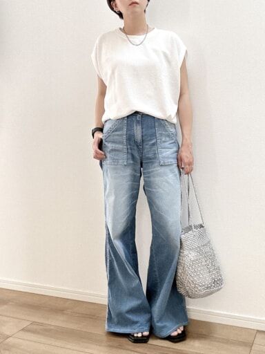 夏コーデにも欠かせないデニムパンツ。今の気分はワイドシルエットだから、イン・アウトどちらも着やすい着丈と裾タック入りで、すっきりと着られる「ループヤーンウエストタックT」が好バランスです。