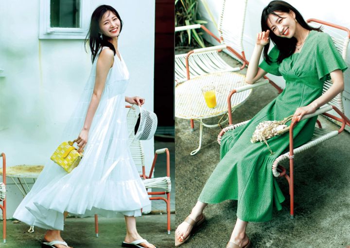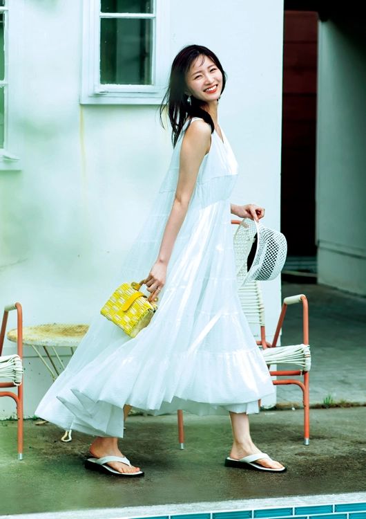 ワンピース¥25,300/FRAY I.D ルミネ新宿2店 ピアス¥14,960、パールネックレス¥19,800/ともにチビ・ジュエルズ(チビ・ジュエルズ・ジャパン) チェーン2連ネックレス¥31,900/エムシー・スタジオ(ズットホリック) リング¥59,400/ココシュニック バッグ¥5,290/ZARA(ザラ) トングサンダル¥6,930/RANDA