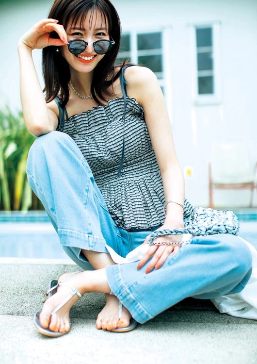 ギンガムキャミソール¥9,900/SNIDEL ルミネ新宿2店 デニムパンツ¥22,000/ROLLAʼS、フラットサンダル¥18,700/Mollini(ともにジャック・オブ・オール・トレーズ) 手に持ったジャケット¥18,700/マイストラーダ サングラス¥52,800/アイヴァン(アイヴァン 東京ギャラリー) ピアス¥11,880/バルブス(ズットホリック) ネックレス¥25,300、バングル¥31,900/ともにノジェス バッグ¥3,960/アネモネ(サンポークリエイト)
