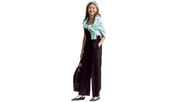 サロペット¥33,000(23区/オンワード樫山 お客様相談室)肩にかけたスウェット¥21,780(オブラダ/シンチ)頭に巻いたスカーフ¥13,200(ガリャルダガランテ/ガリャルダガランテ 青山店)ピアス¥55,000リング(2つセット)¥56,650(ともにサードリーズンズ/エリオポール代官山)バッグ¥148,500(J&M デヴィッドソン/J&M デヴィッドソン カスタマーセンター)パンプス¥161,700(ピエール アルディ/ピエール アルディ 東京)