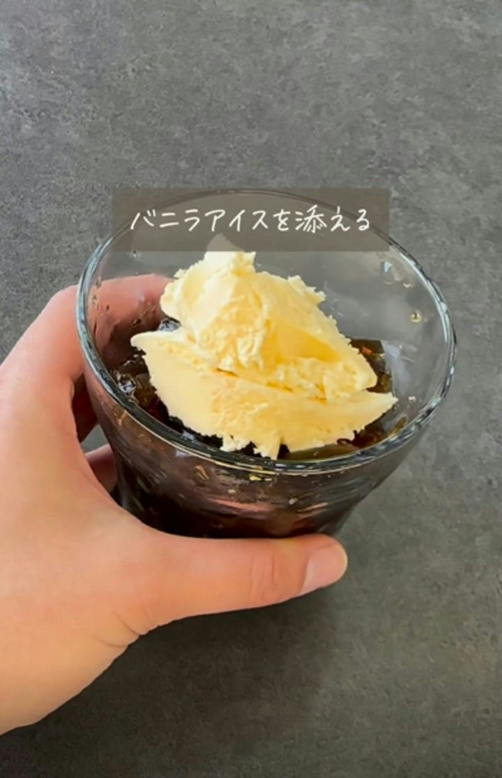 バニラアイスをスプーンなどですくって、コーヒーゼリーの上にのせます。