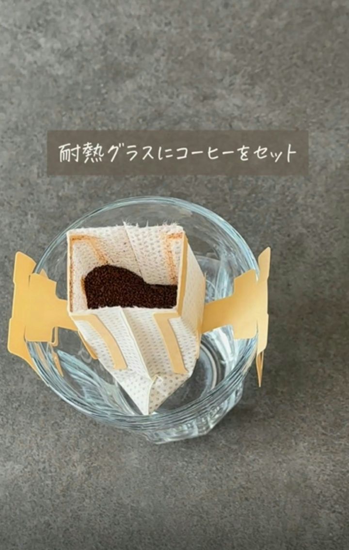 耐熱グラスを用意し、ドリップコーヒーをセットします。