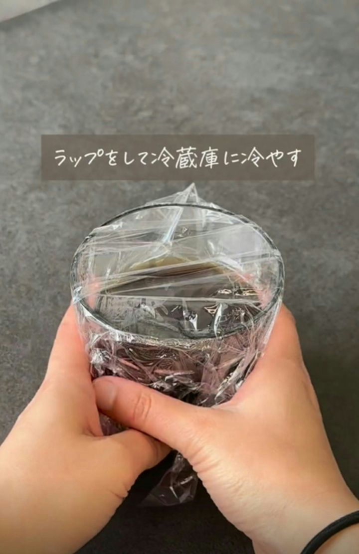 冷まして粗熱を取ってから、コーヒーを取り外し、耐熱グラスにラップをしてから冷蔵庫に入れて冷やします。
