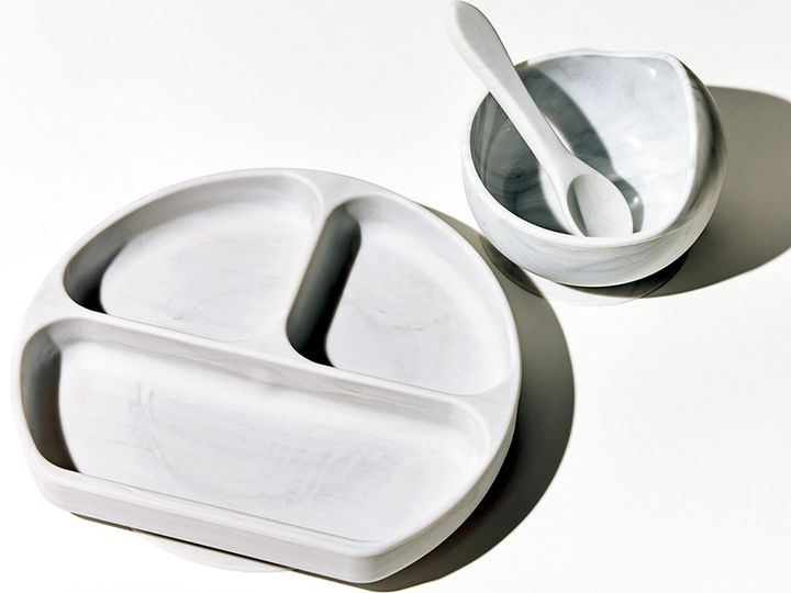 ORDER:公式オンラインストア、各種オンラインストアにて購入可。プレートは手前の形状が直線で体に引き寄せやすく、ボウルはすくいやすいアーチ状。自力で食べる力を育むことができる3点セット。電子レンジ、冷凍庫も対応可なのがママには嬉しい!