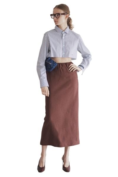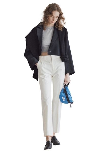 細身でまとめた、まじめな上下を今に寄せる、クロップト丈のエッセンス。ウエストまわりの肌見せにより、アイテムのイメージはコンサバでもありきたりじゃないルックスへと進化。