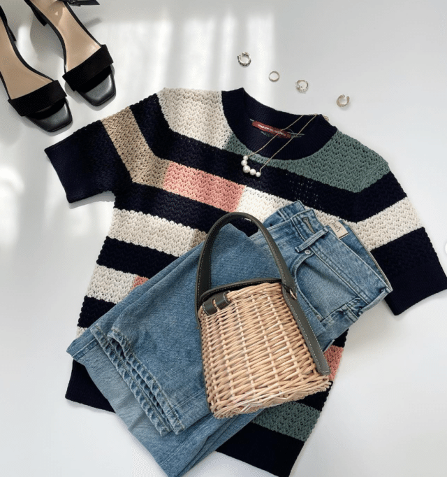 多色なリネンコットンオープンワークセーターに加え、更に色を加える・特徴的なデザインを合わせてしまうと、まとまりのない印象を与えてしまいます。その為、スカートやオーバーオールなどシンプルかつ色味を抑えた組み合わせが大切になってきます!