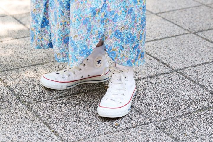 真っ白な〈コンバース〉のオールスターは、ハイテクすぎないシンプルなデザインと真っ白な色味で、洗練さをキープしながら、華やかなワンピースをほどよくカジュアルダウンしてくれます。