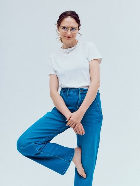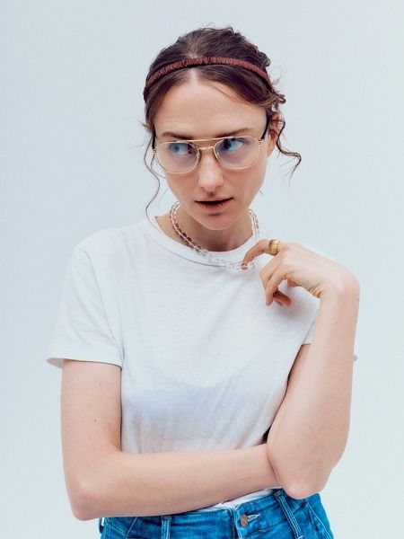 究極にシンプルな白Tは、顔まわりがぼけない工夫を凝らして。クリアパール、ブラウンカチューシャ、ゴールドフレームの眼鏡。透明感やなじみのいいカラーで、随所にさりげない縁取りを構成。