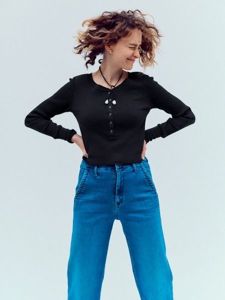 タイトなヘンリーネックに結んだスエードコードとパールのニュアンス